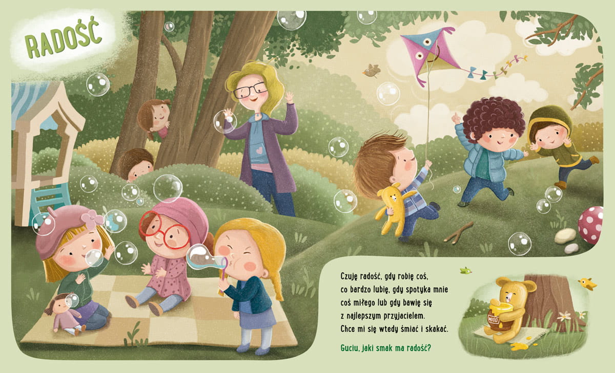 Jak zawsze Felusiowi towarzyszy ukochany miś Gucio, który tłumaczy zawiły język emocji na bliskie i zrozumiałe każdemu maluchowi doświadczenia zmysłów – dla Gucia radość ma słodki smak, spokój przypomina dźwięki harfy, a tęsknota jest jak deszczowy dzień.