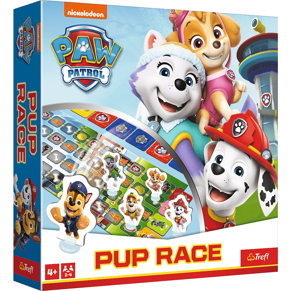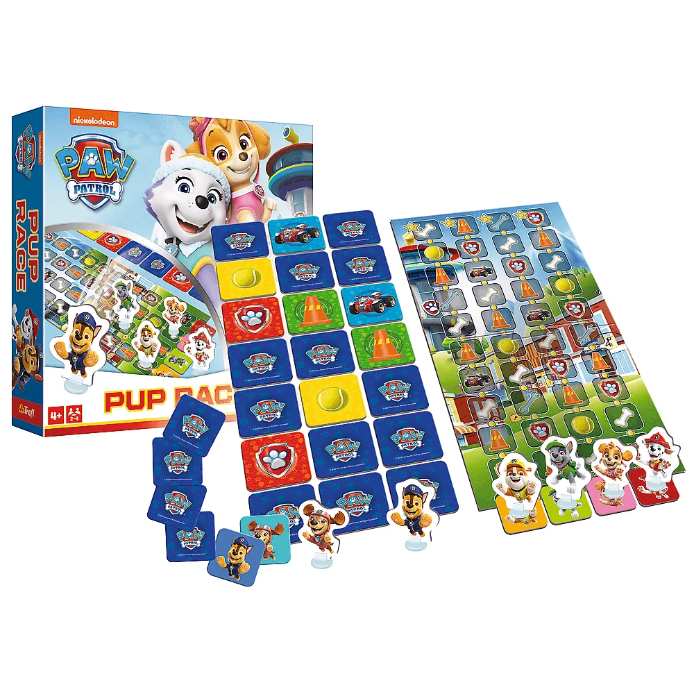 Przygotuj się na psi wyścig w grze Pup Race! Aby wygrać, musisz wykazać się dobrą pamięcią! Dołącz do bohaterów serialu Psi Patrol i spróbuj dotrzeć jak najszybciej do celu. Gra planszowa nie tylko rozwija pamięć, ale też umiejętność podejmowania ryzyka. Gra jest przeznaczona dla 2 do 4 graczy, a średni czas rozgrywki wynosi 15-20 minut.