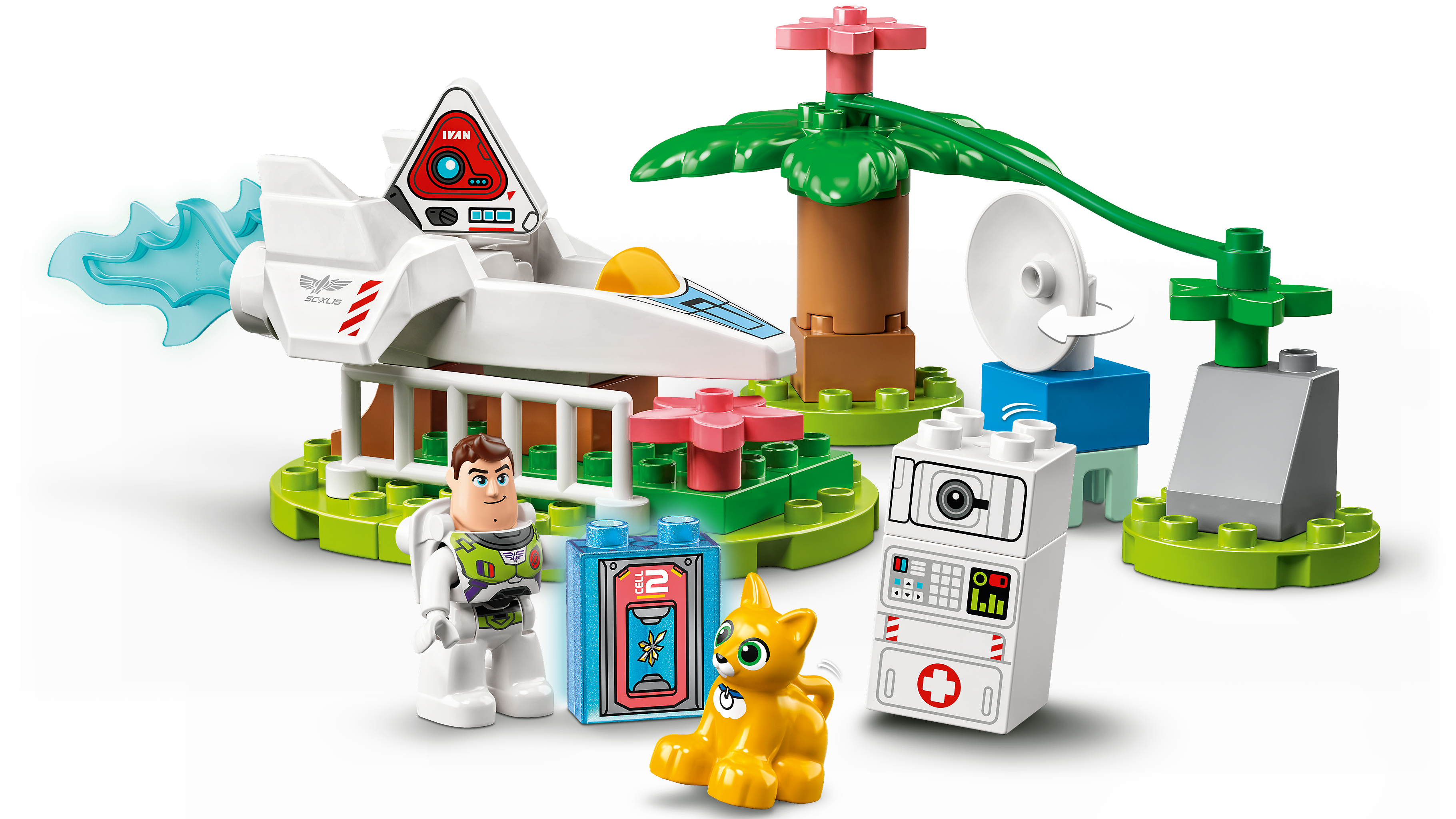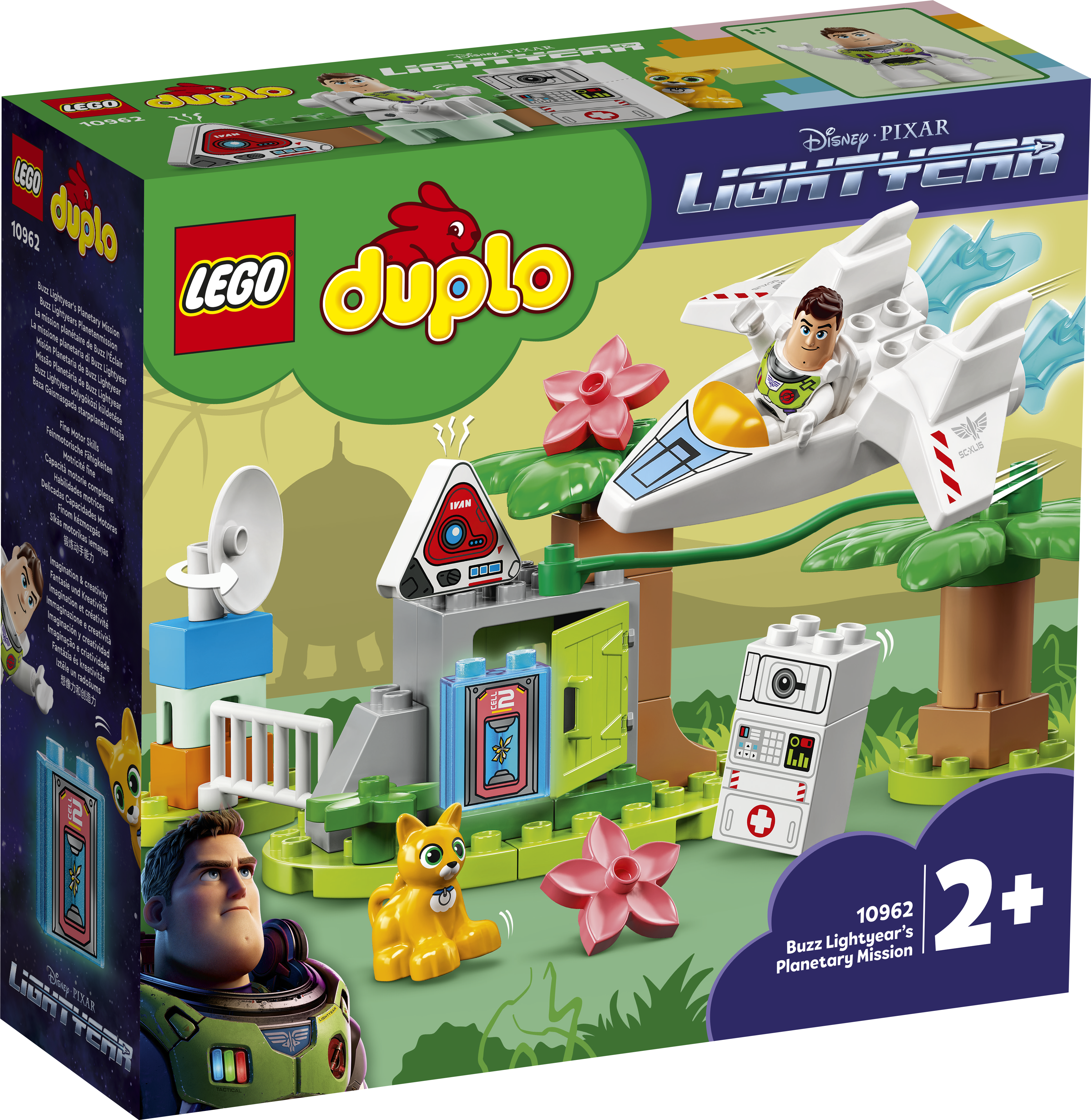 - Planeta pełna atrakcji — w komplecie figurka LEGO® DUPLO® Disney and Pixar Buzza Astrala, mechaniczny kot Sox, komputer Ivan, trójkątny droid Eric, statek kosmiczny, fascynujące miejsca i ciekawe akcesoria