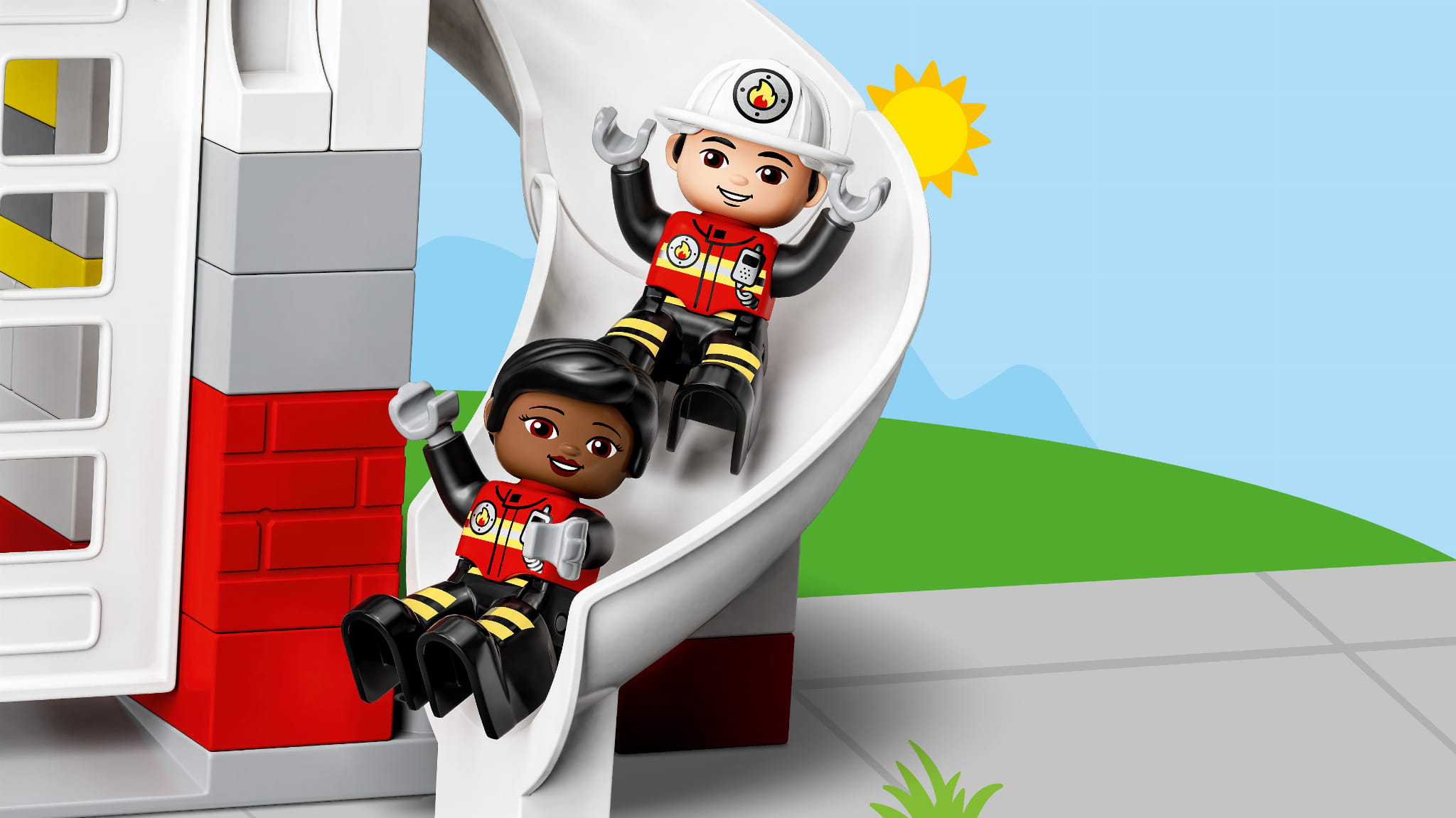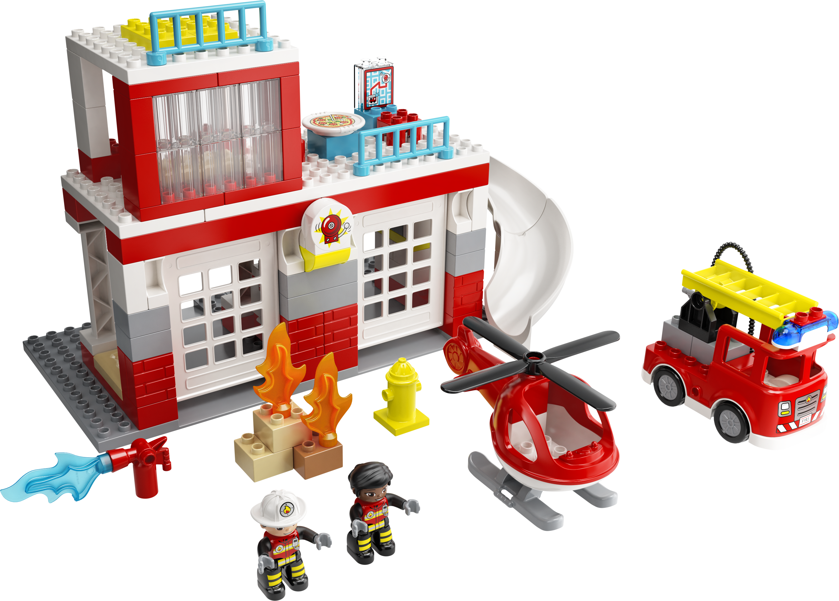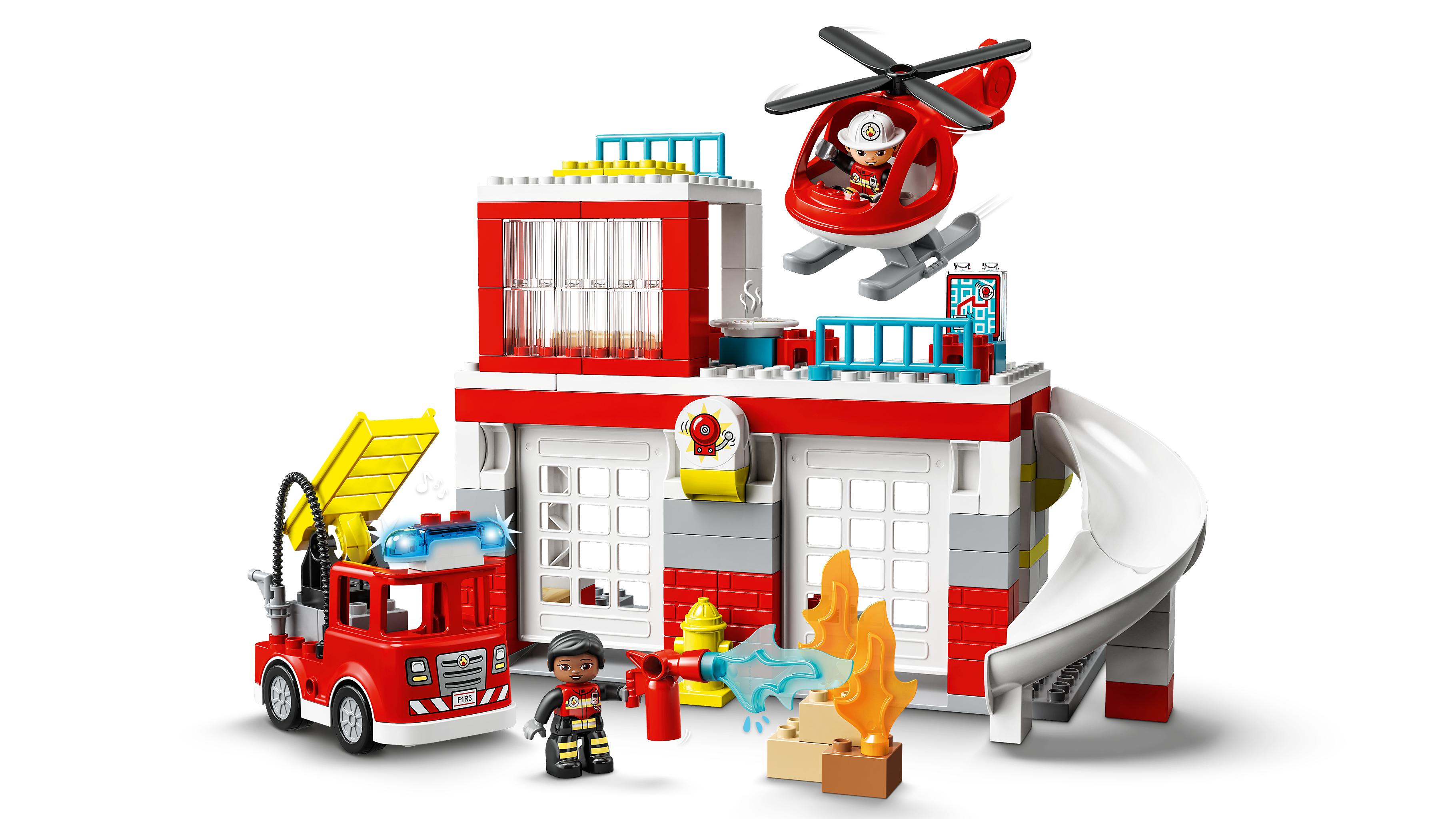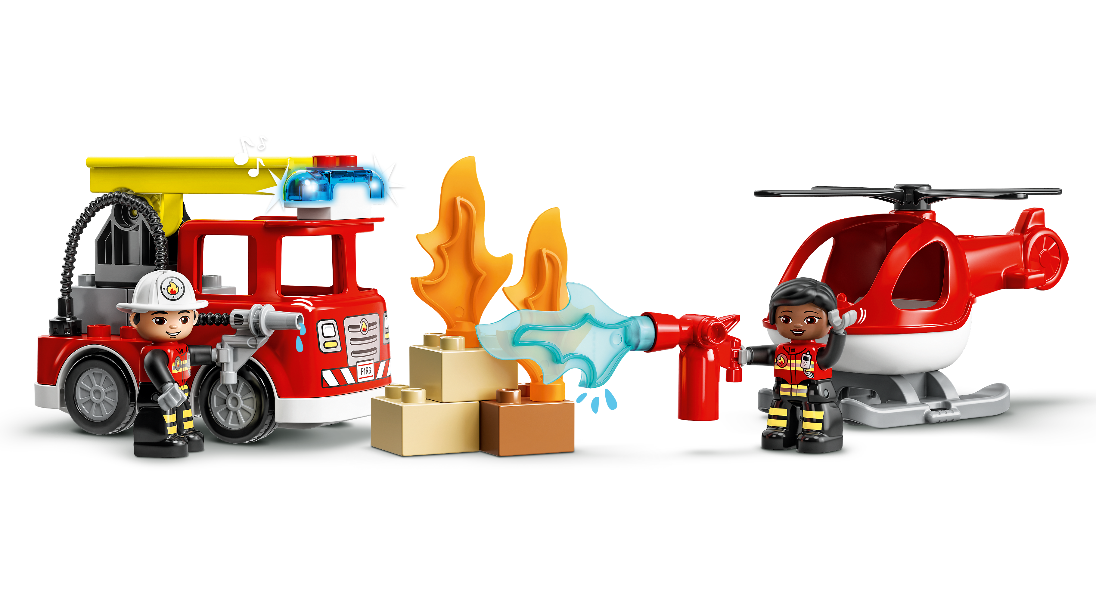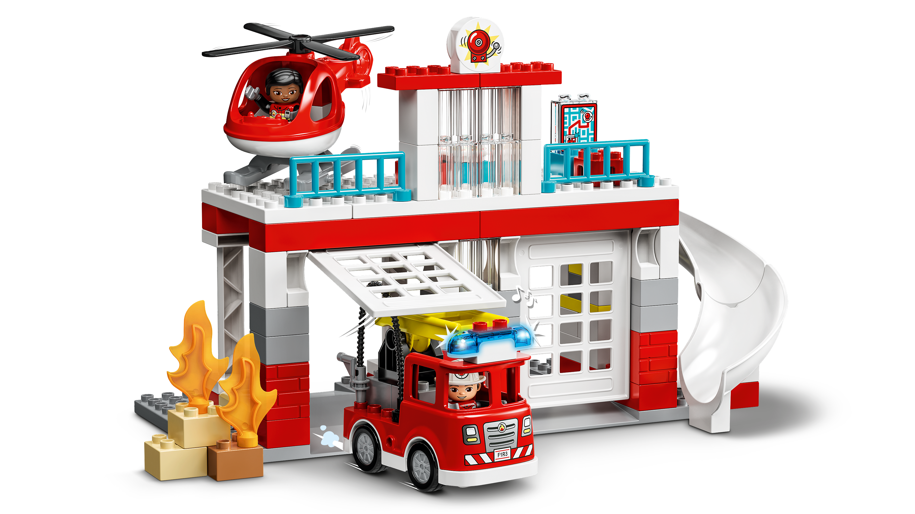 - Ciekawa remiza strażacka — w zestawie LEGO® DUPLO® Rescue Remiza strażacka i helikopter (10970) znajdziesz sympatyczne figurki, wesołe funkcje i mnóstwo możliwości rozwijającej zabawy