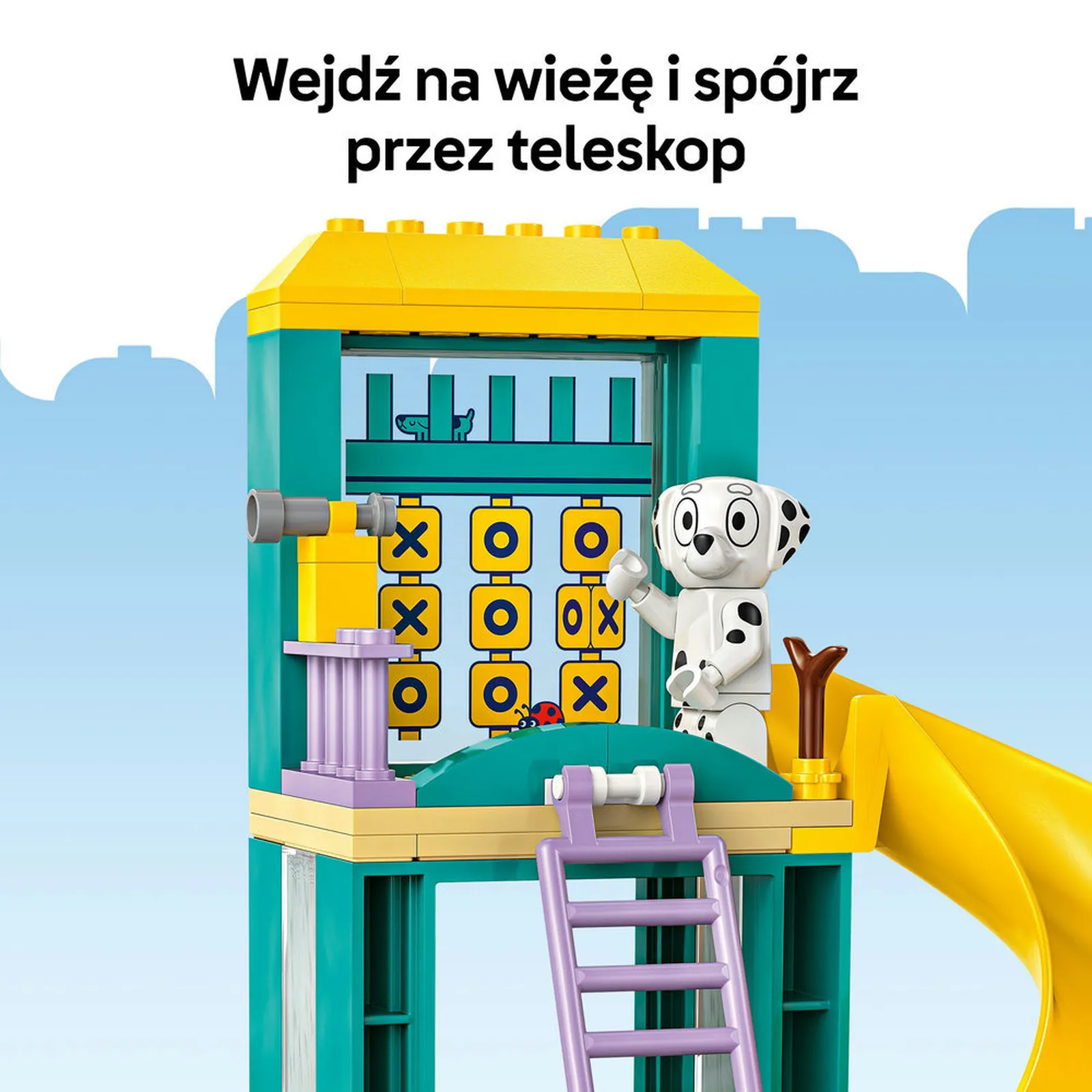 Ta wielofunkcyjna zabawka z placem zabaw zawiera minifigurki znanych piesków: Blue i Łatko, które bawią się na kolorowym placu zabaw z huśtawką, zjeżdżalnią, małpim gajem i obracającym się pelikanem. W zestawie są także trzy rośliny, po których postacie mogą skakać, wieża z teleskopem i miejsce na piknik z napojami i ciastami.