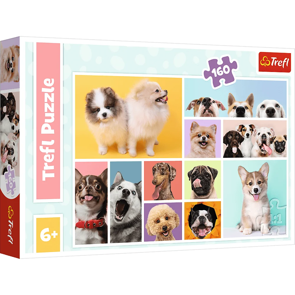 Wyjątkowe puzzle dla dzieci przedstawiają psią przyjaźń, czyli urocze pieski pozujące razem. Zestaw puzzli składa się ze 160 elementów i pozwala ułożyć kolorowy obrazek o wymiarach 410x278 mm.Wysoką jakość, nasycenie kolorów i bezpieczne układanie zapewnia kalandrowany papier odblaskowy oraz zastosowanie materiałów przyjaznych środowisku.