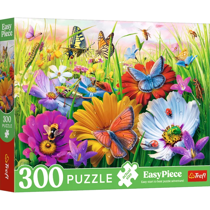Puzzle EasyPiece 300 el. Owady na łące po ułożeniu stworzą obraz o wymiarach 600x400mm, przedstawiający przeróżne owady wśród kolorowych kwiatów. Produkt wykonano w Polsce przy użyciu wysokokiej jakości materiałów. Tekturowe opakowanie przyjazne środowisku wykonano z materiałów posiadających certyfikat FSC, a folię na opakowaniu zastąpiono stickerami.