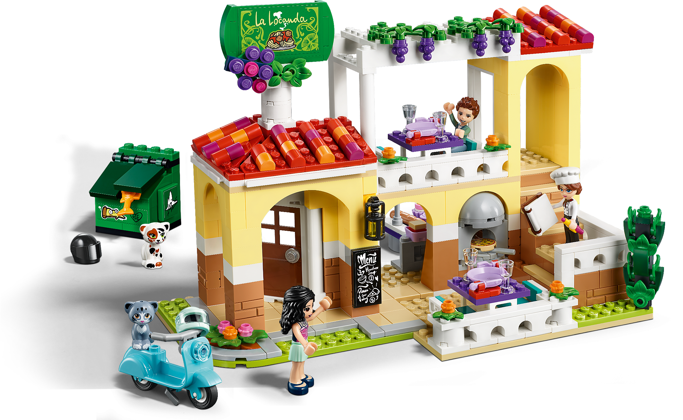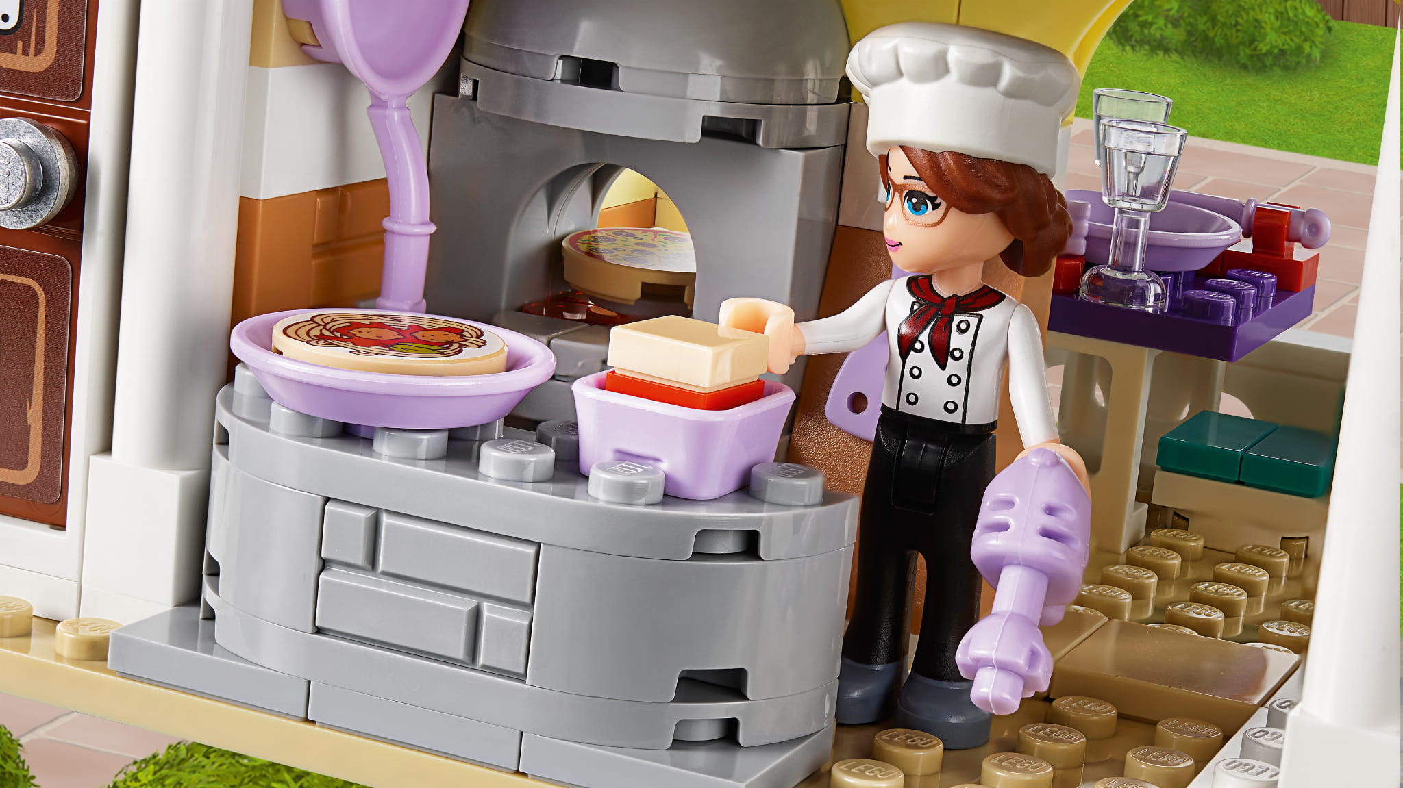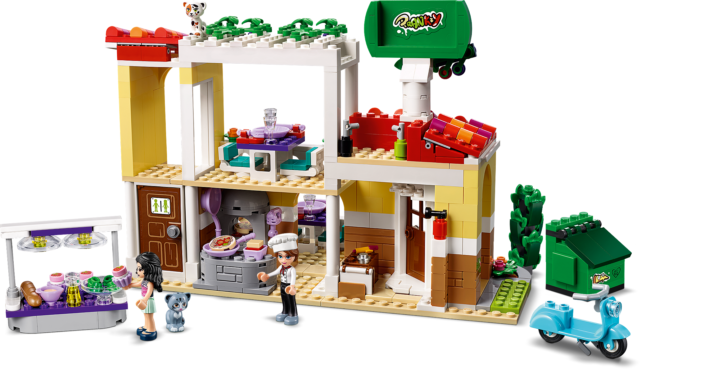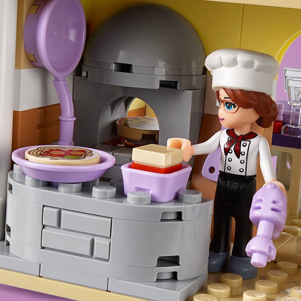 - W restauracji LEGO® Friends znajdują się: piec do pizzy, recepcja, część jadalna na balkonie, kuchnia, WC, kontener na śmieci i miejsca na zewnątrz.
