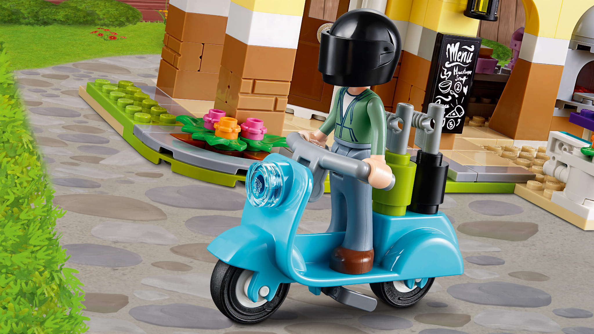 - Zestaw zawiera dwupiętrową restaurację, skuter LEGO i wózek do serwowania sałatek.