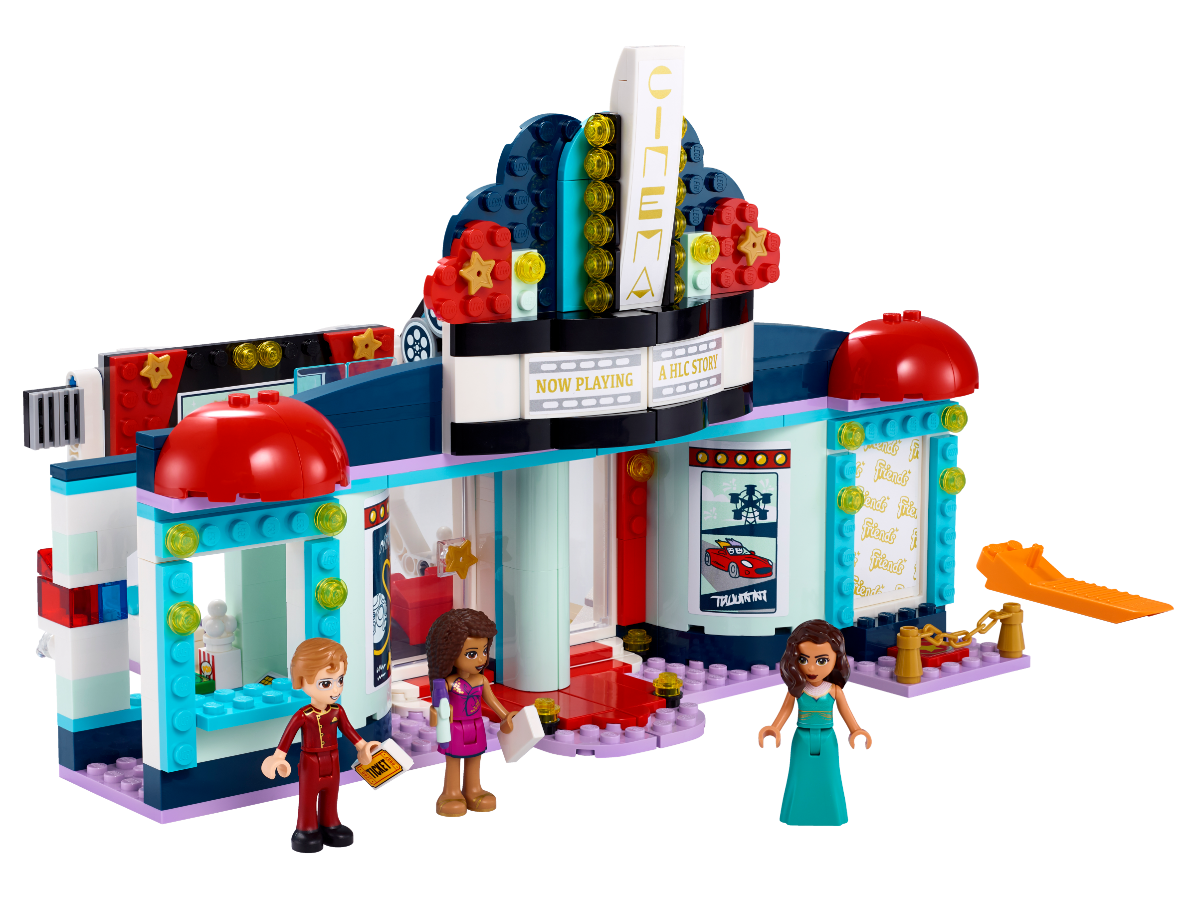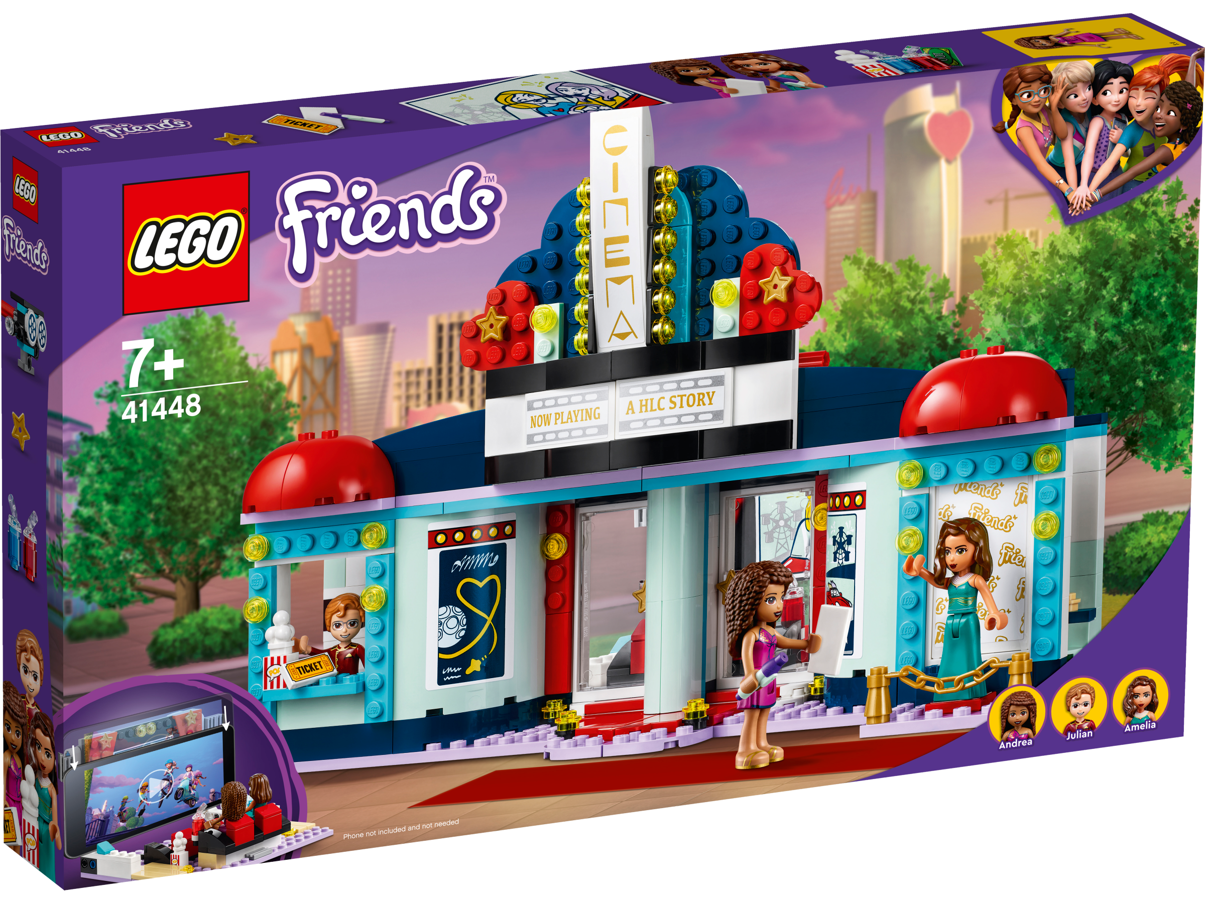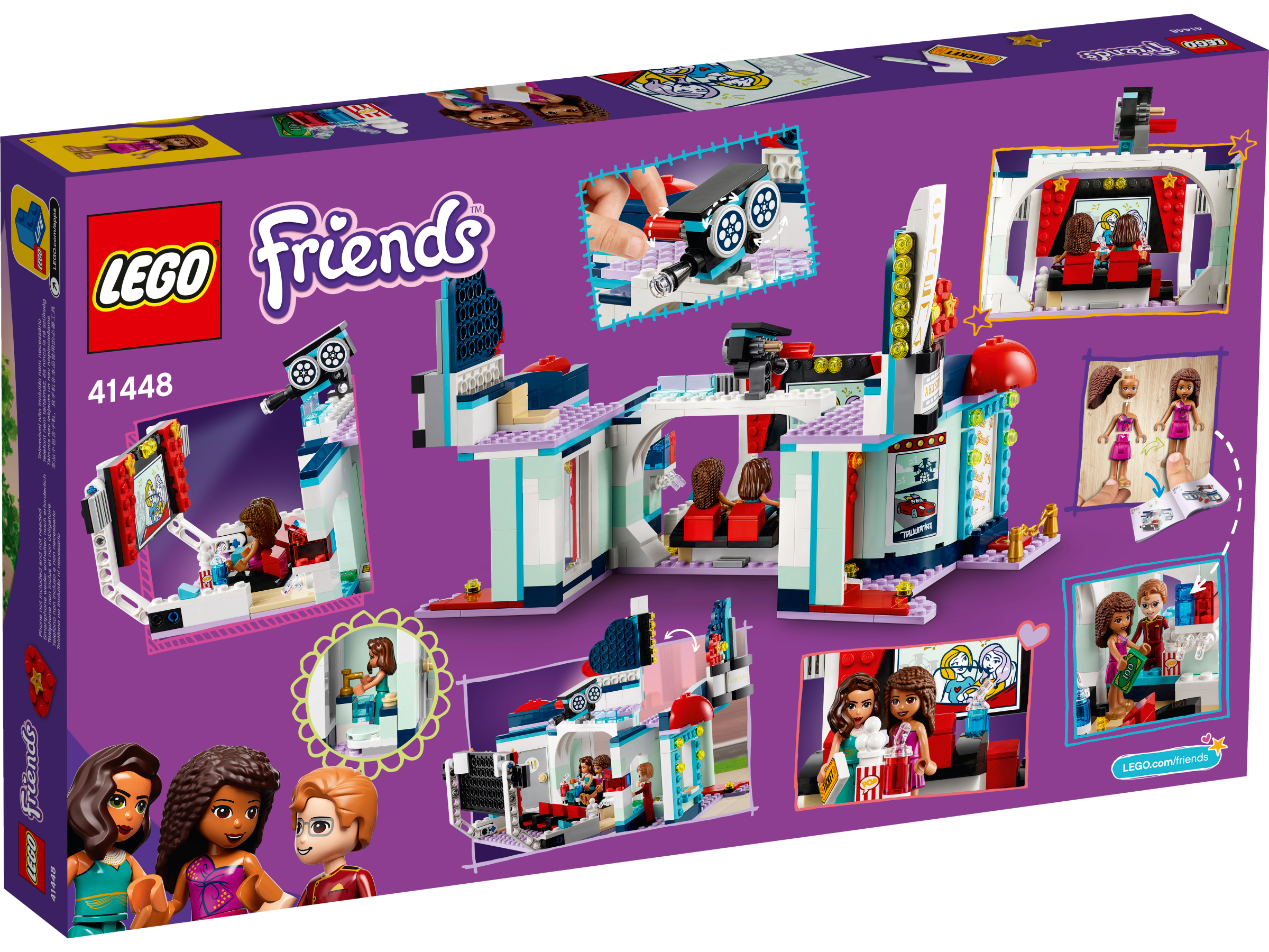 - Zabawka mieści kasę biletową i czerwony dywan po jednej stronie, a dzięki zawiasom otwiera się, tworząc salę projekcyjną, toaletę i kiosk z popcornem. W pudełku jest mini laleczka Andrea LEGO® Friends i dwie inne mini laleczki.