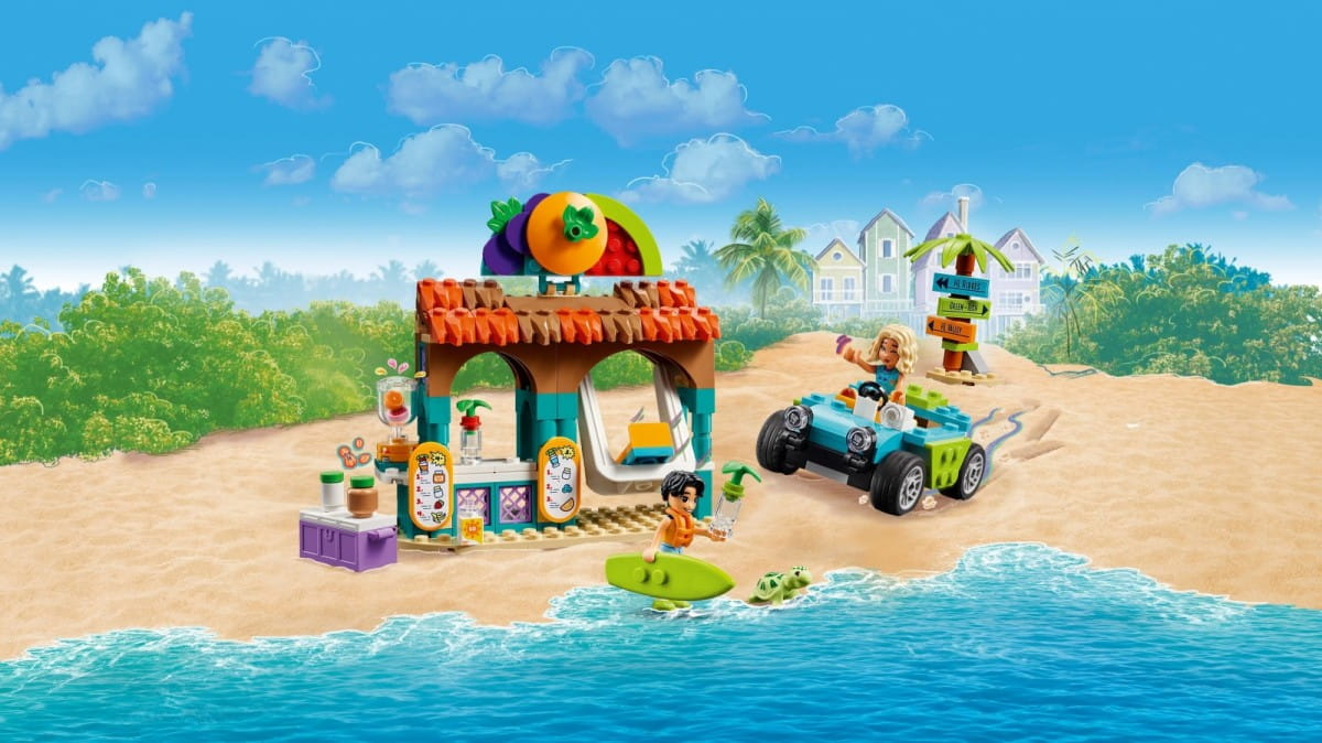 Dzieci mogą tworzyć wiele różnych smaków koktajli, łącząc składniki, a następnie mieszając je w blenderze. Mogą bawić się, że Nova i Niko odpoczywają przy koktajlu na huśtawce, a następnie wyruszają na wycieczkę łazikiem plażowym. Ten zestaw konstrukcyjny LEGO zawiera mnóstwo akcesoriów pobudzających wyobraźnię, w tym menu, deskę surfingową, kamizelkę ratunkową, wideorejestrator i drogowskaz.