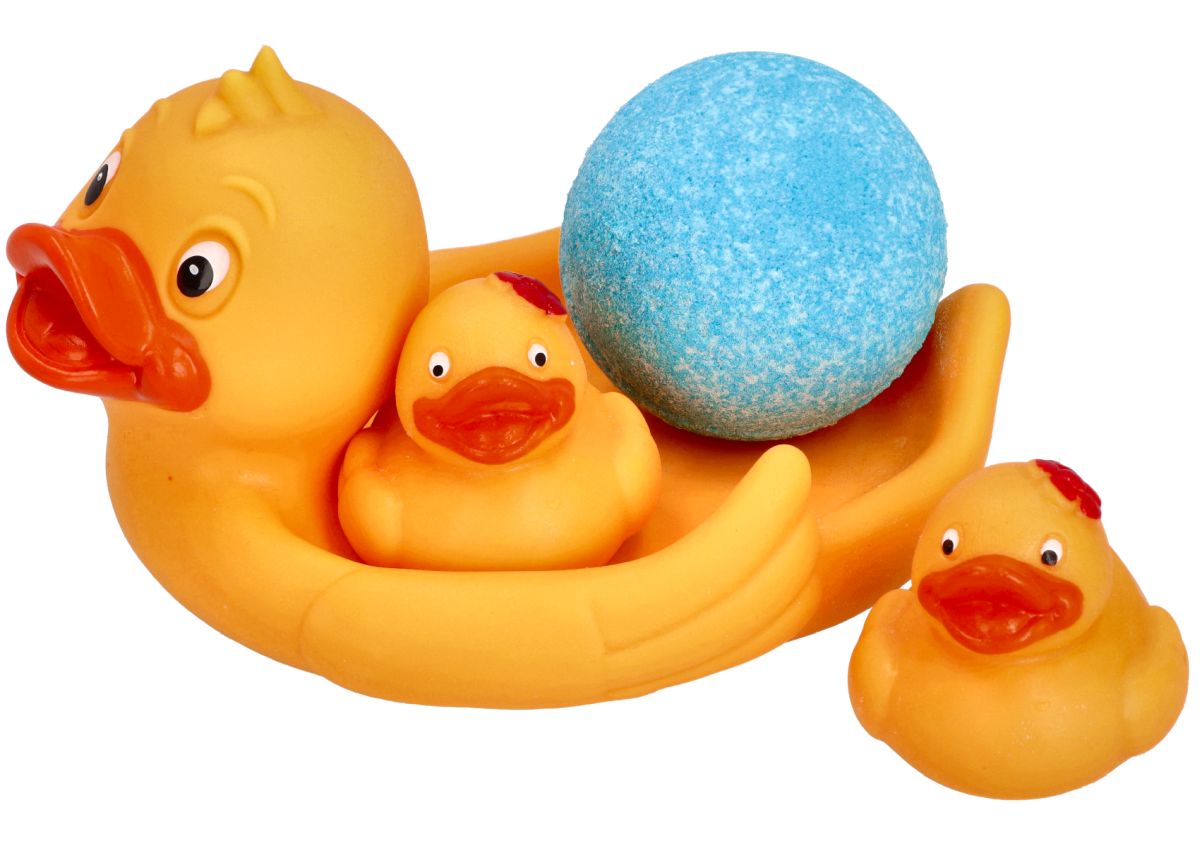 Zestaw składa się z trzech kaczek: mamy kaczki i dwóch kaczuszek. Duża kaczka może pełnić rolę mydelniczki na której można umieścić kulę dołączoną do zestawu.