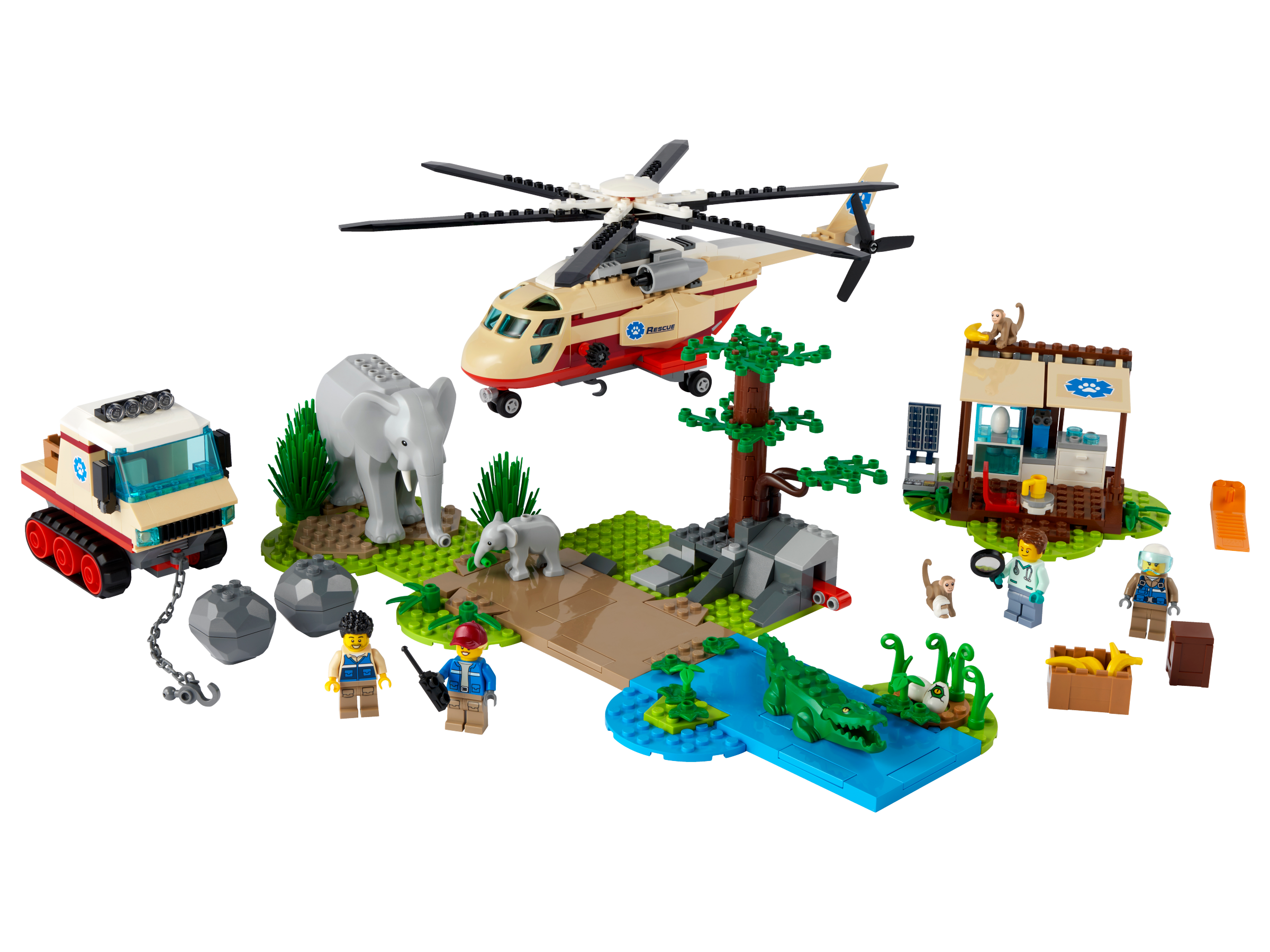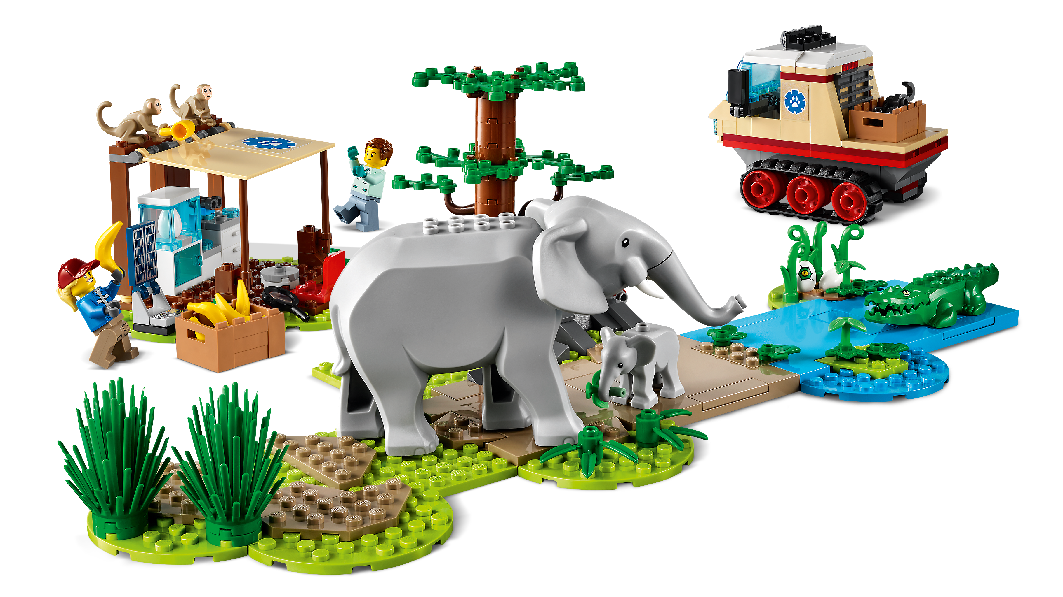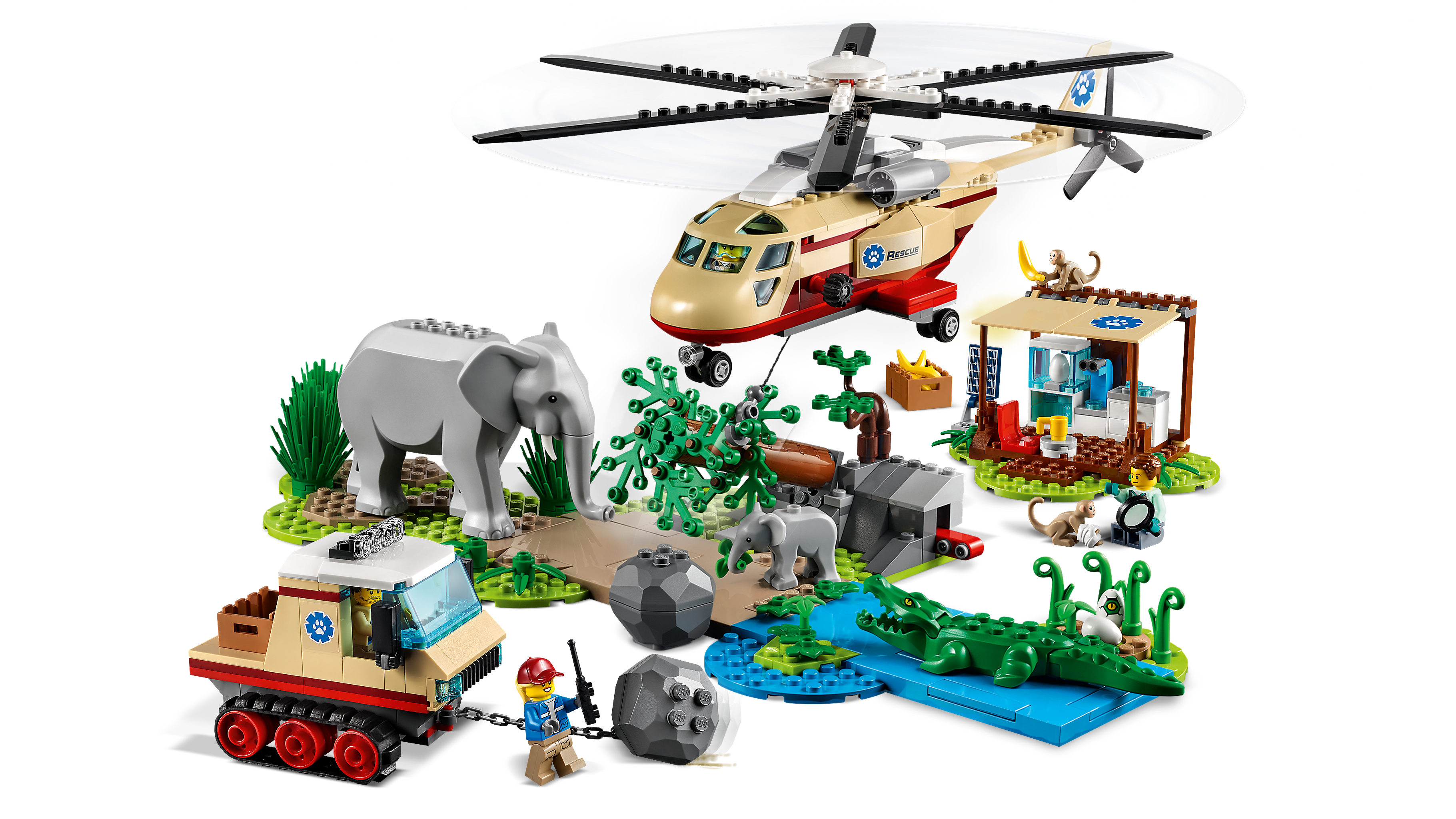 - Dzieci znajdą tu wszystko, czego potrzeba do zbudowania helikoptera z wyciągarką, pojazdu gąsienicowego, kliniki weterynaryjnej, scenerii sawanny z funkcją osuwiska, a także figurki słonia, słoniątka i krokodyla, dwie figurki małp i cztery mini figurki.