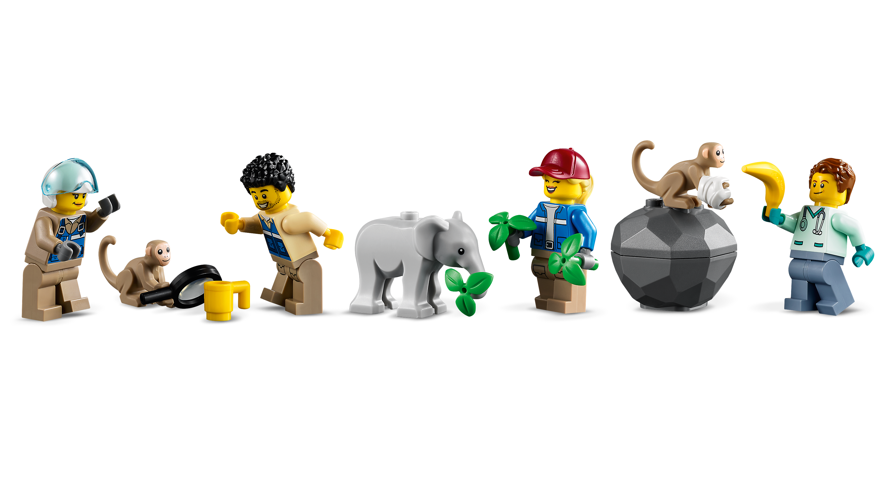 - Zestaw zawiera akcesoria LEGO®, takie jak lupa, banan, gips dla małpy, kubek, różne przyrządy laboratoryjne oraz jajo krokodyla.
