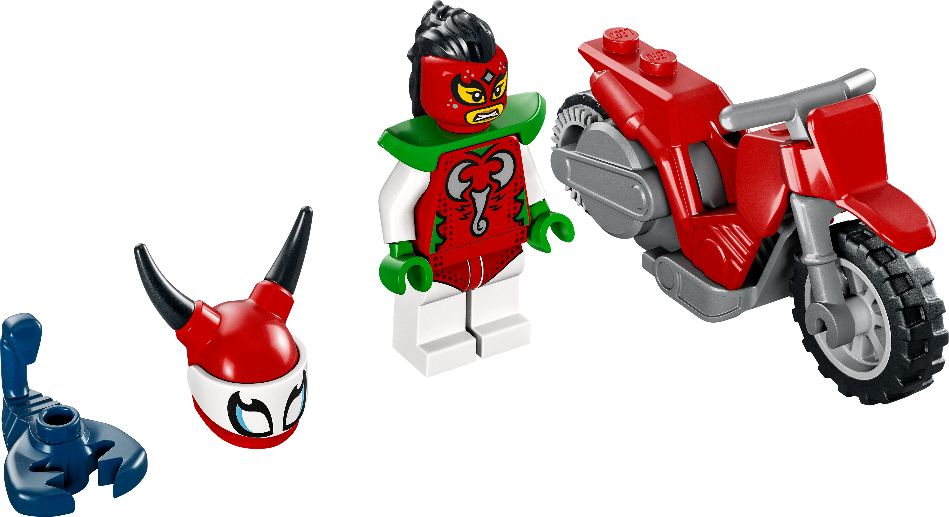 - Zawartość opakowania — w środku jest wszystko, czego dzieci potrzebują do zbudowania motocykla kaskaderskiego napędzanego kołem zamachowym oraz minifigurka LEGO® City Stuntz Skorpiona Luchadory i figurka skorpiona