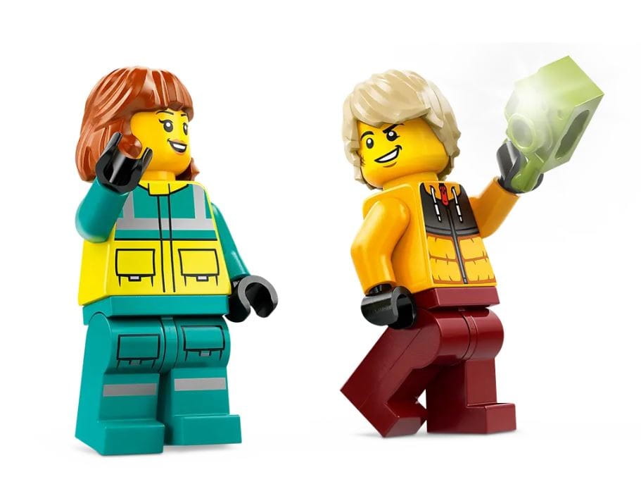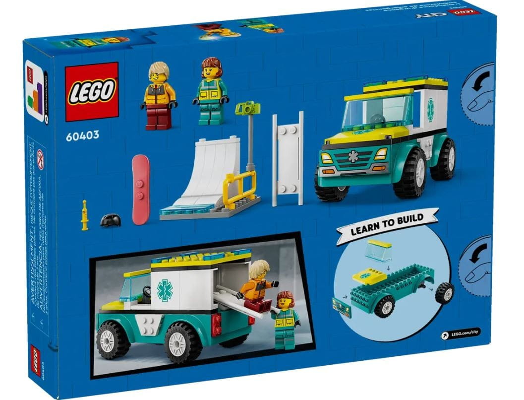 - Zawartość pudełka - ten zestaw zawiera wszystko, czego potrzebują dzieci, by zbudować karetkę i ośnieżony skatepark, a także minifigurki snowboardzisty i ratownika