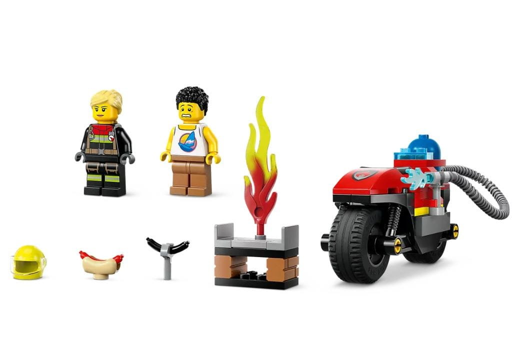 - Zawartość pudełka - zestaw z pojazdem ratunkowym zawiera wszystko, czego potrzebują dzieci do zbudowania motocykla strażackiego, scenkę z pożarem na grillu i dwie minifigurki, w tym strażacką