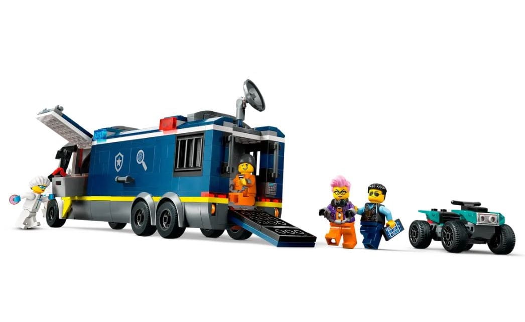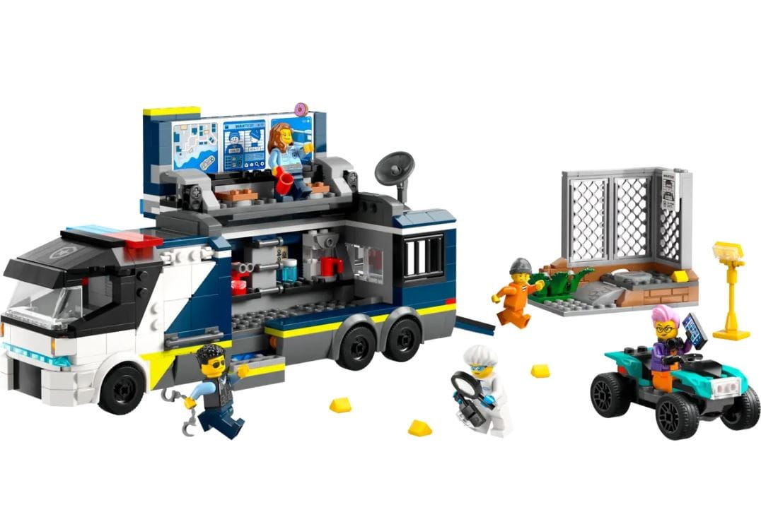 Ten fajny zestaw dla dzieci w wieku od siedmiu lat zawiera zabawkową ciężarówkę, która po otwarciu ukazuje dwupoziomowe laboratorium kryminalistyczne z miejscem do pracy, mapą, ekranami monitoringu, mikroskopem, ekspresem do kawy i celą. W zestawie jest także scenka śledcza i quad złodziejaszków. Dodajmy do tego jeszcze dwie minifigurki policjantów, technika kryminalistyki i dwóch złoczyńców i można gotować się na epickie przygody!