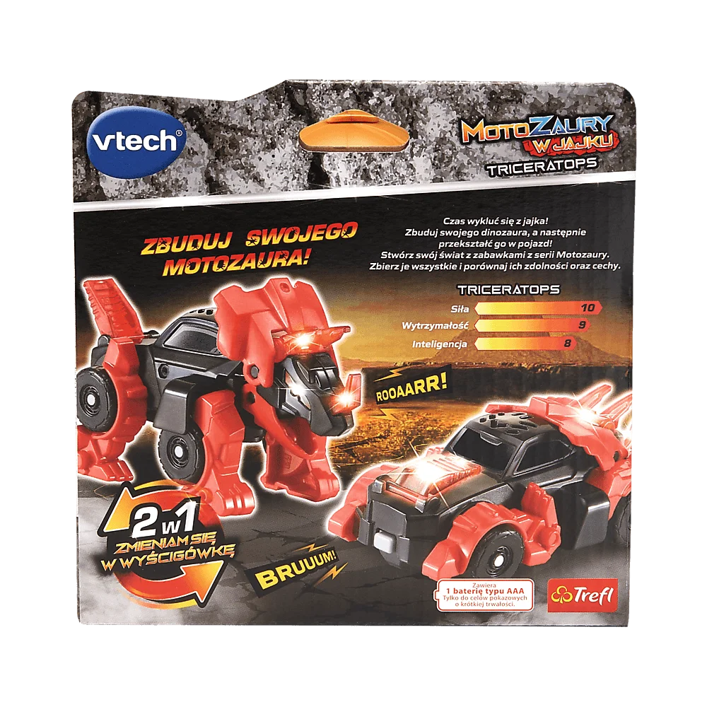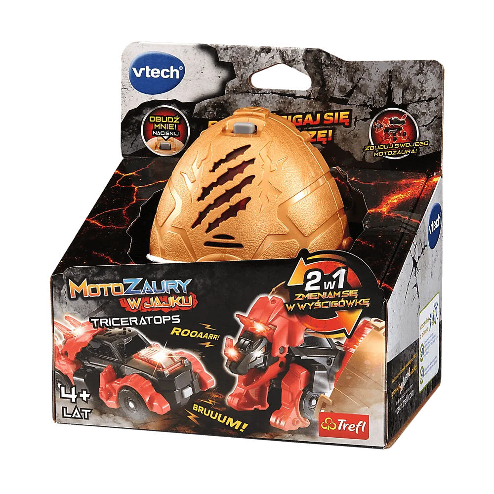 Czas wykluć się z jajka! Odkryj niezwykłą zabawkę z Motozaurami Vtech, która łączy świat dinozaurów z fascynującą motoryzacją! Zbuduj potężnego Triceratops w jajku , a potem przekształć go w dynamiczną wyścigówkę. Dzięki efektom świetlnym, realistycznym dźwiękom i zabawnym frazom, zabawa nabiera zupełnie nowego wymiaru!