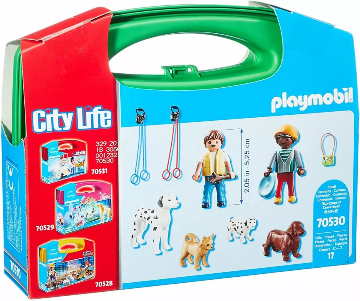 W tym zestawie z serii City Life można znaleźć nie tylko wygodną w transporcie walizeczkę, ale także mnóstwo fajnych akcesoriów do odgrywania scenek o tematyce życia miejskiego oraz przyjemnego spaceru z psami.
