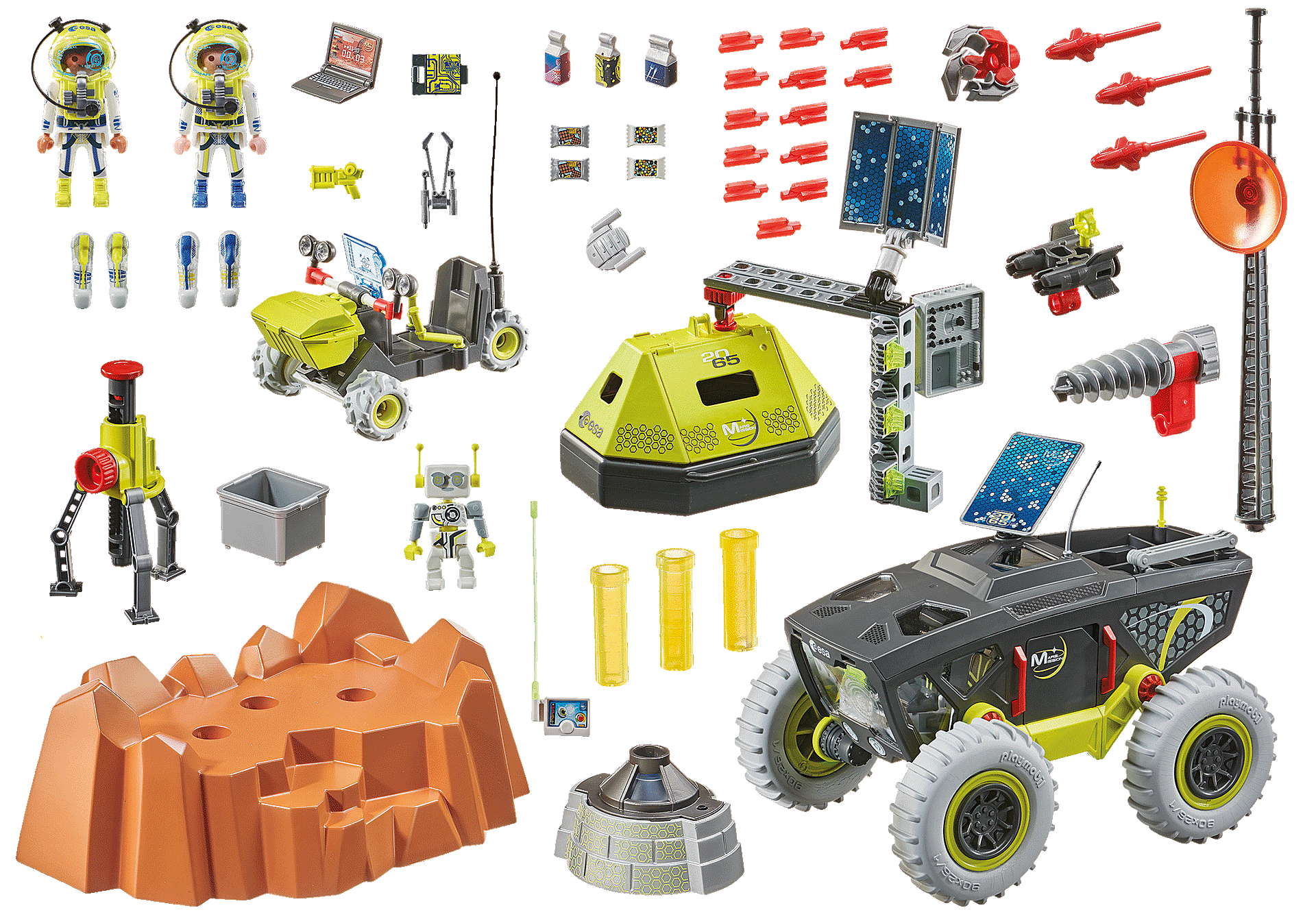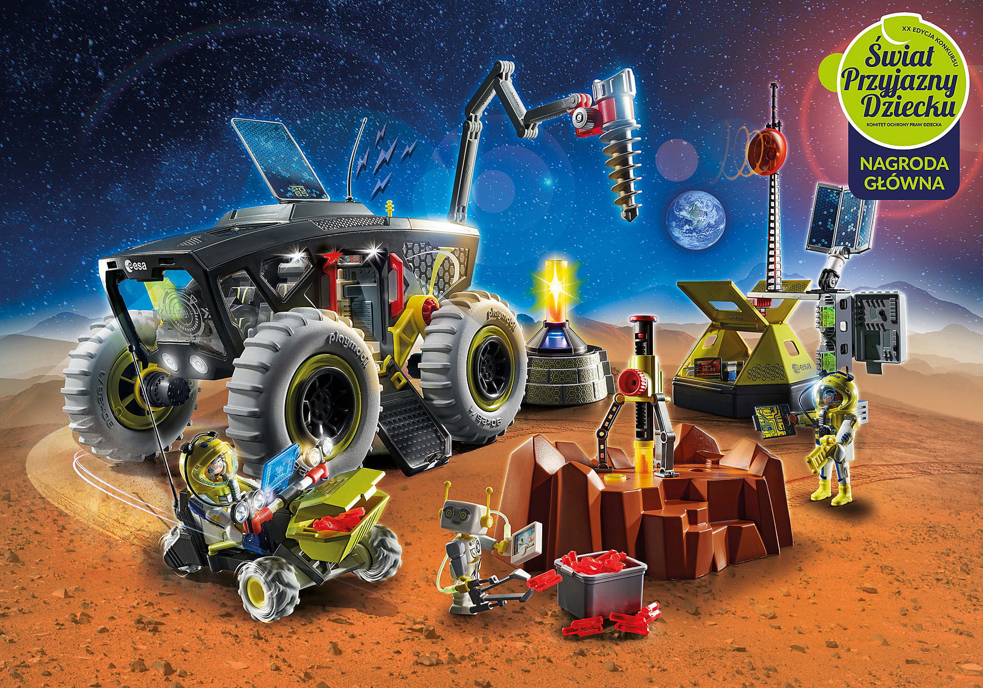 Ekspedycja na Marsa z pojazdami 70888. Ruszaj na różnorodne kosmiczne przygody razem z PLAYMOBIL. W łaziku marsjańskim za pomocą światła i dźwięku możesz eksplorować czerwoną planetę. Wiertarka służy do poszukiwania minerałów w skale. Jeśli astronauci odkryją coś interesującego, zamień nasadkę wiertła na ramię chwytaka i ostrożnie podnieś przedmiot. W stacji badawczej wszystkie próbki są szczegółowo badane. Aby pokonywać krótsze odległości, astronauci używają zwinnego marsjańskiego trójkołowca. Jakie spostrzeżenia uzyskają astronauci podczas tej ekspedycji? Zestaw do zabawy zawiera dwóch astronautów PLAYMOBIL, łazik marsjański ze światłem i dźwiękiem, trójkołowiec marsjański, stację wiertniczą, laboratorium badawcze, robota i wiele innych dodatków do ekscytujących misji na Marsie. Wszystkie mechanizmy świetlne i dźwiękowe mają funkcję automatycznego wyłączania.