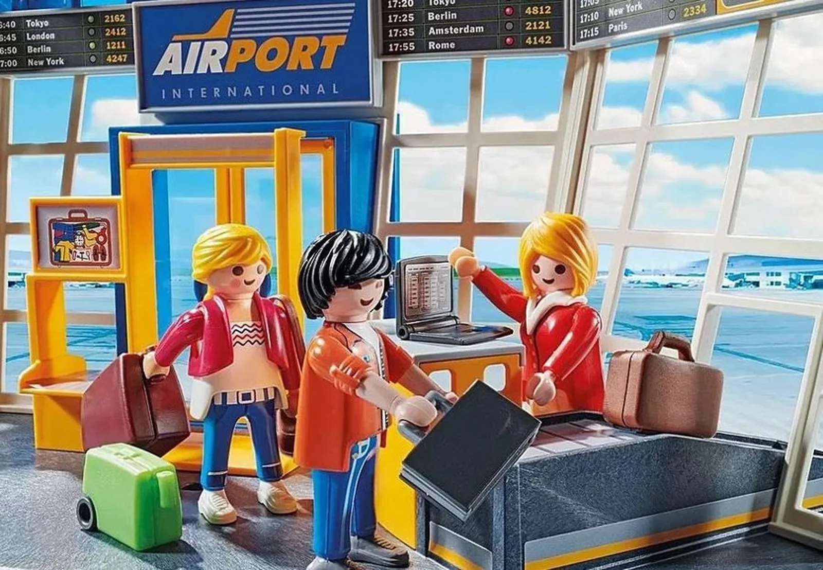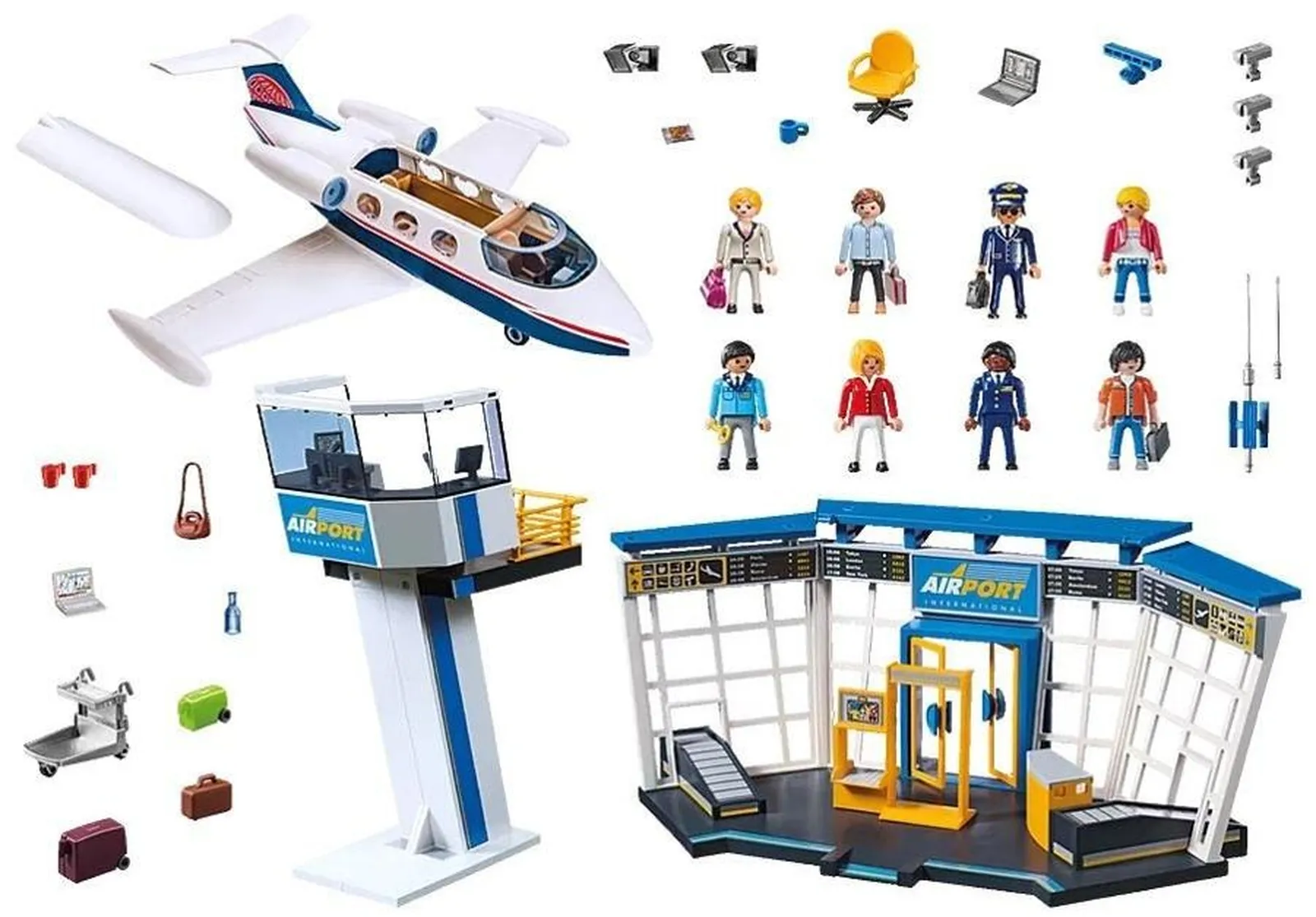 Zestaw Playmobil lotnisko z wieżą kontroli, stanowiskiem odprawy i kontrolą bezpieczeństwa, samolot Playmobil z pilotem, pasażerami i wieloma innymi akcesoriami.