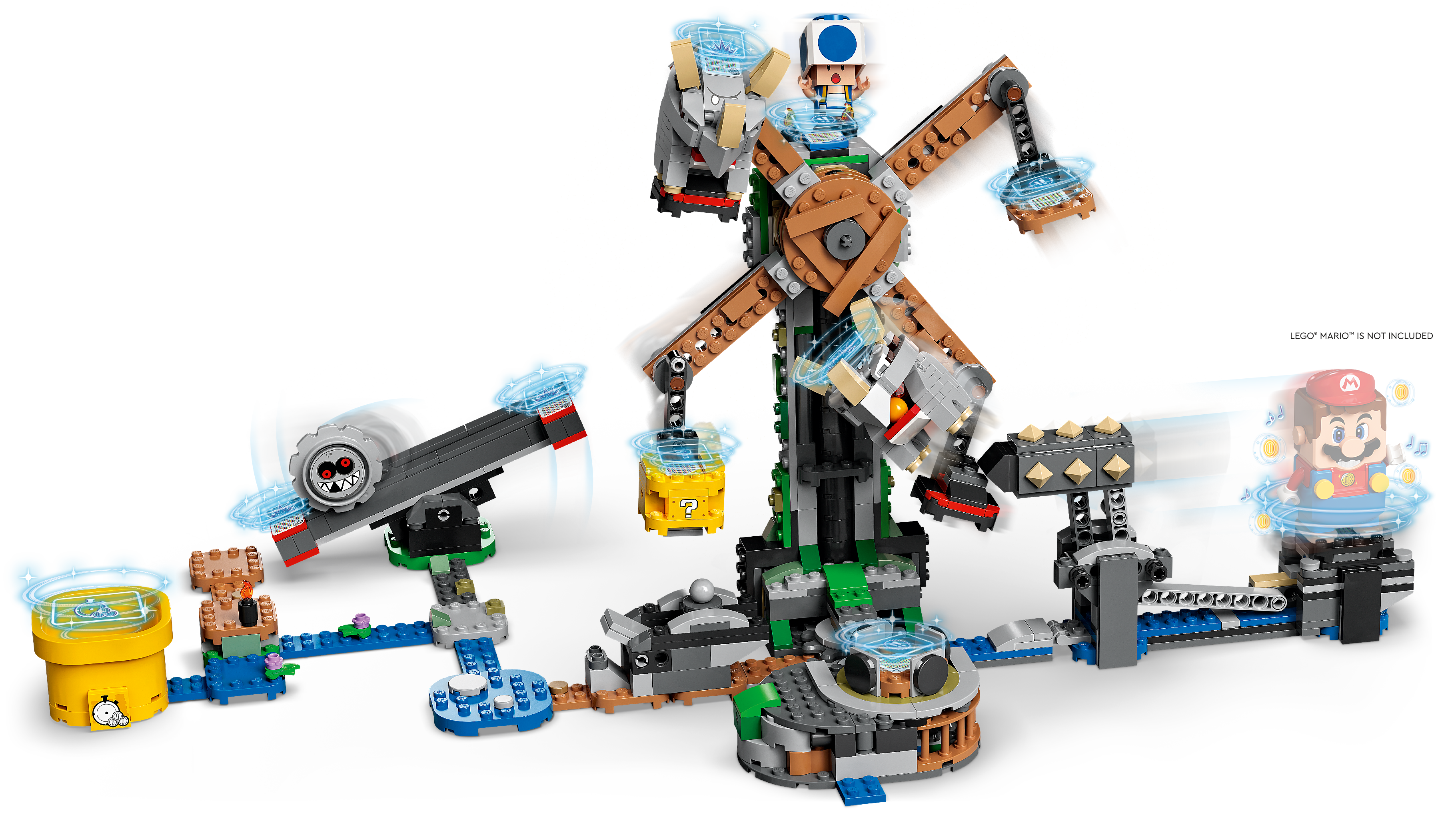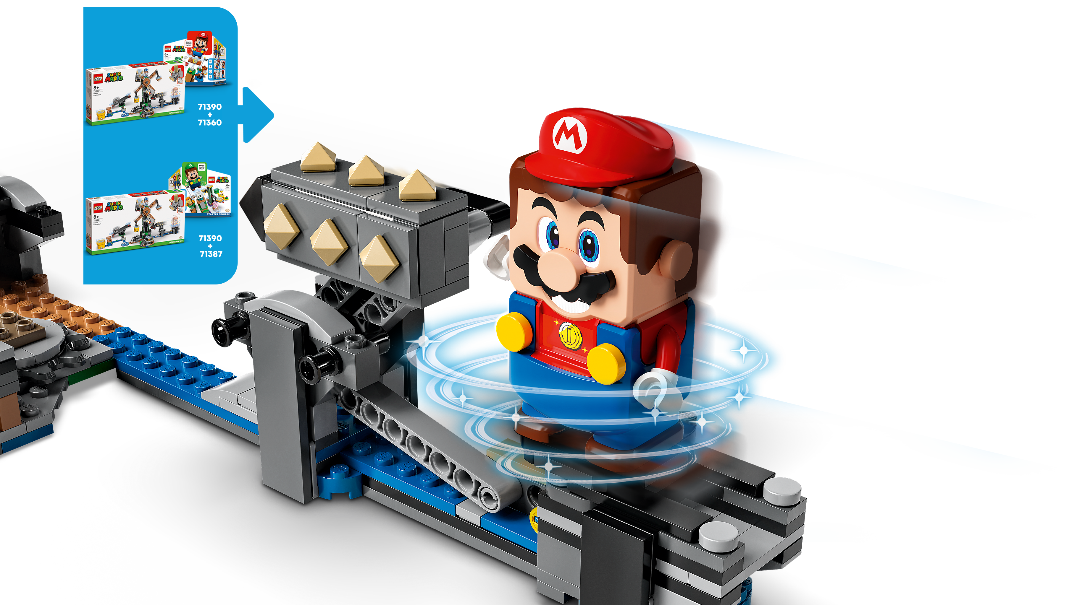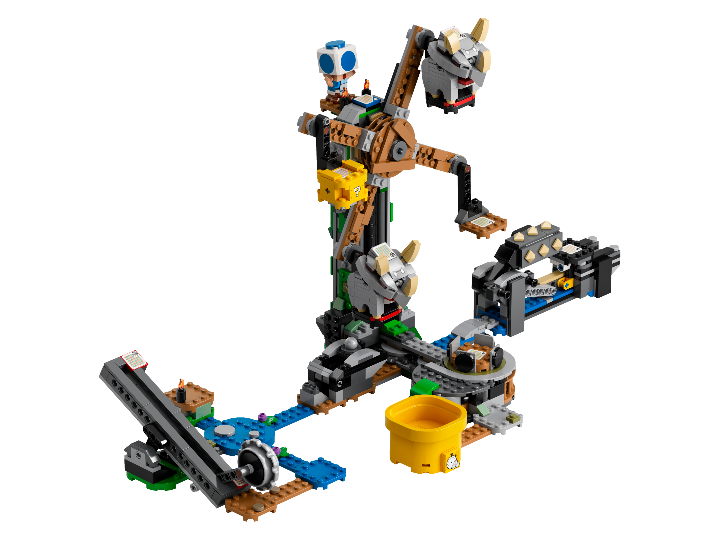 Połącz ten ciekawy zestaw dodatkowy ze swoim zestawem startowym LEGO® Super Mario™! Skocz na obydwa końce huśtawki Grrrola, aby otrzymać monety. Obróć platformy za pomocą szpikulca i strąć z nich Reznory. Dotrzyj do pytajnikowego bloku, zdobądź nagrody i uratuj niebieskiego Toada. Współpracuj ze znajomym, który ma figurkę LEGO® Luigi™ lub LEGO® Mario™ albo zmierzcie się, kto szybciej zbierze monety dzięki specjalnej rurze szybkiego biegu!