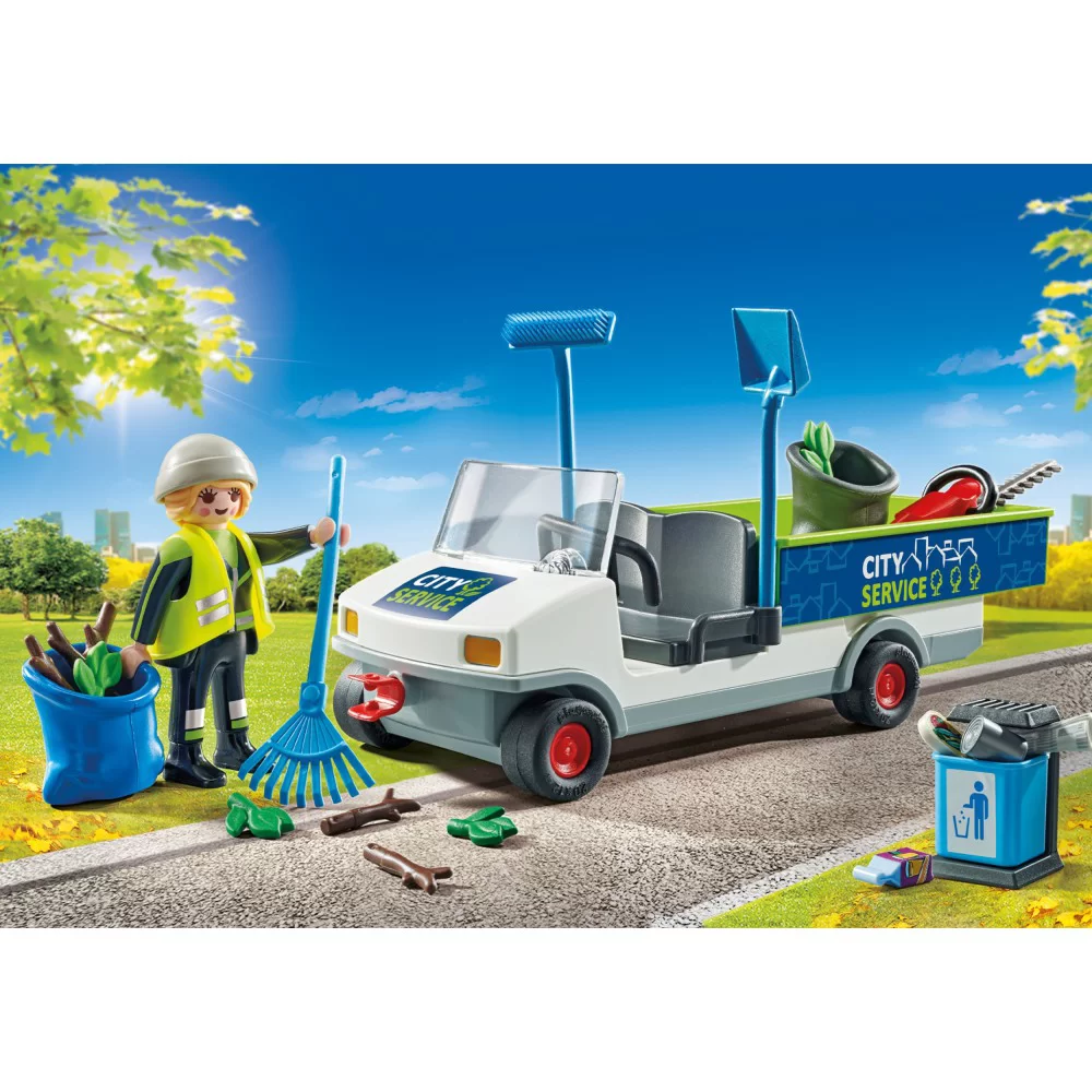 Zespół sprzątający miasto z ogromnym zaangażowaniem dba o czystość. Pojazd Playmobil z dużą przyczepą pozwala przewozić narzędzia do sprzątania oraz zebrane odpady. Jest zasilany elektrycznie, dzięki czemu jest przyjazny dla środowiska naturalnego.