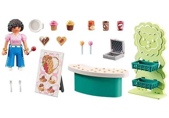 Co tak pięknie pachnie? Dzięki świeżym gofrom, babeczkom i lizakom Stoisko ze słodyczami PLAYMOBIL w magiczny sposób przyciąga małych i dużych gości. Czy to z cukrem pudrem, sosem jabłkowym czy kremem czekoladowym, te gofry są po prostu pyszne! Po tak smakowitej przekąsce zakupy sprawiają jeszcze więcej przyjemności. Idealny zestaw na mały prezent lub upominek dla miłośników słodyczy w wieku od 4 lat.