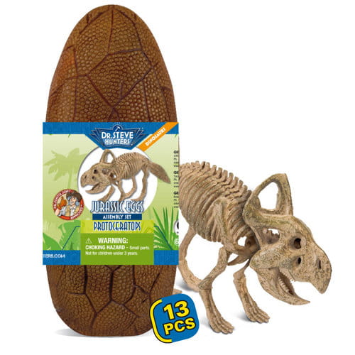 Jajo dinozaura o wysokości 19 cm, we wnętrzu którego znajdziesz 13 fragmentów szkieletu prehistorycznego dinozaura. Z elementów możesz własnoręcznie złożyć szkielet Protoceratopsa o długości 23 cm. Jak wszystkie zestawy Geoworld, zabawkę wykonano pod nadzorem paleontologów, dzięki czemu posiada szczególne walory edukacyjne.